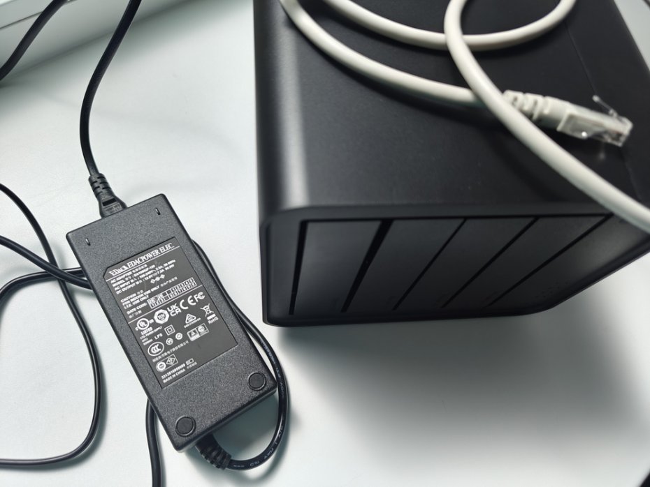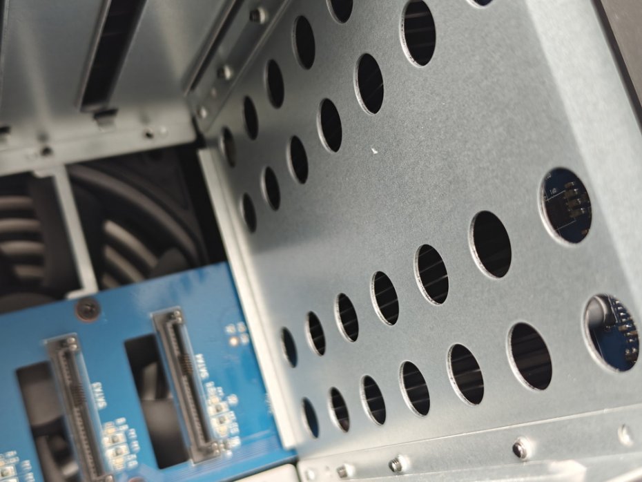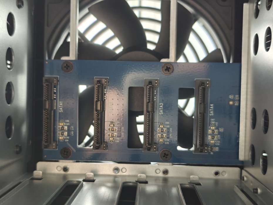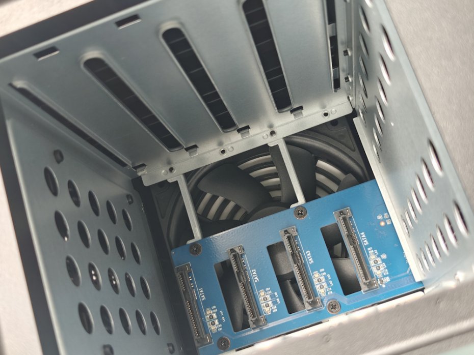 Внутреннее оснащение F4-424 впечатляет: материнская плата с процессором Intel N95, 8 ГБ оперативной памяти DDR5, работающей в двухканальном режиме, с возможностью расширения до 32 ГБ, два сетевых порта со скоростью 2,5 Гбит/с, пара высокоскоростных USB 3.2 Gen 2 для подключения периферийных устройств, HDMI для вывода изображения на внешний монитор и охлаждающий вентилятор. Общую производительность можно увеличить, установив один или два NVMe SSD в слоты M.2 для кэширования. Поддерживаются различные уровни RAID, а также файловые системы BTRFS и EXT4. Вентилятор работает почти бесшумно, он необходим для охлаждения накопителей, чтобы они не вышли из строя из-за перегрева.