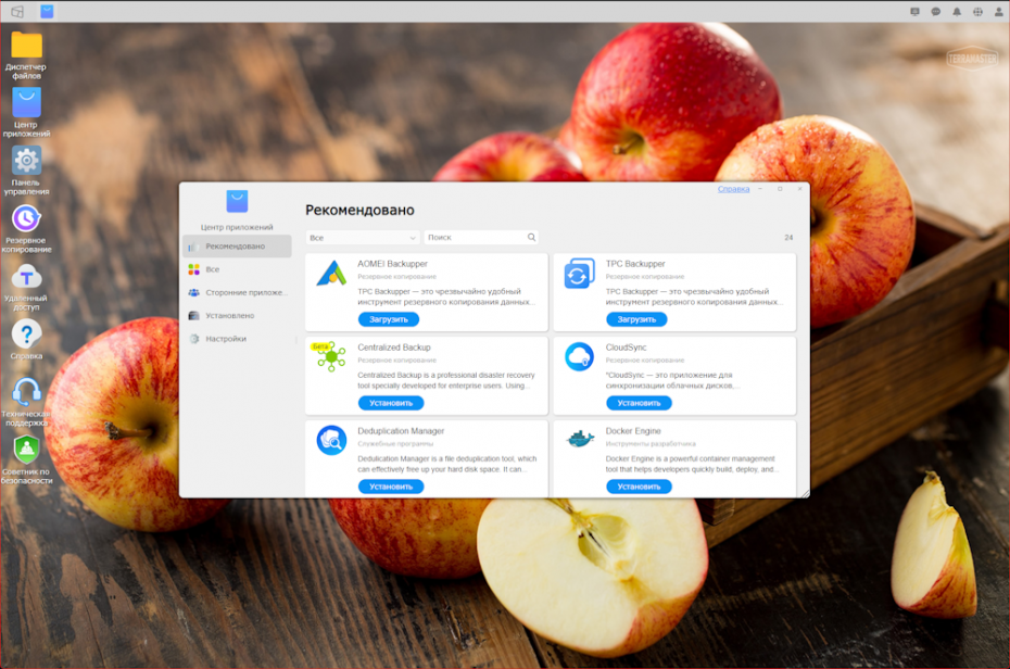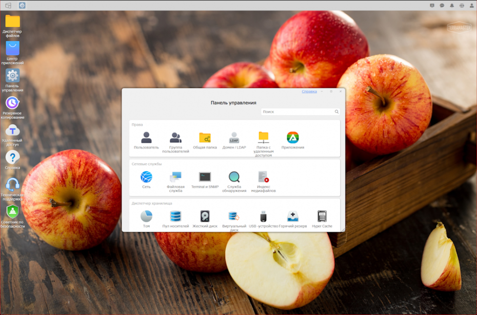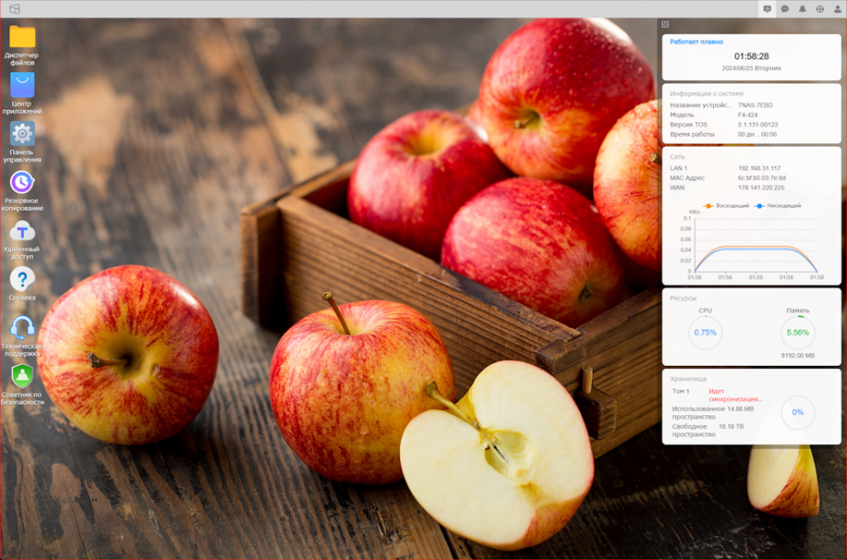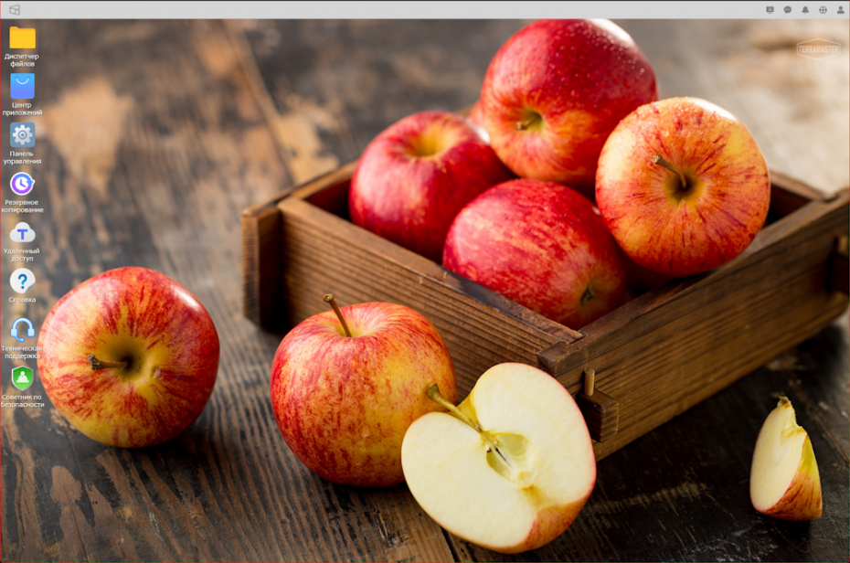 После инициализации пользователю становится доступна операционная система TOS с интерфейсом, напоминающим Windows. Это неудивительно, учитывая, что данный NAS фактически является специализированным компактным компьютером. TerraMaster предлагает десятки приложений для работы с файлами: организацию медиасервера, облачную синхронизацию, совместный доступ к файлам и многое другое. Доступ к данным возможен как локально, так и удаленно, с поддержкой шифрования и детальной настройкой прав доступа. Прошивка включает встроенный файловый менеджер, различные настройки, систему восстановления файлов и средства связи с техподдержкой.