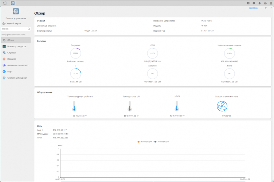 Процесс подключения и настройки F4-424 предельно прост. Необходимо соединить NAS с роутером или компьютером через LAN-кабель и открыть в браузере сайт start.terra-master.com. Альтернативно можно использовать утилиту TNAS PC с сайта производителя. При первичной настройке данные на дисках будут удалены, а процесс синхронизации может занять несколько часов в зависимости от объема.