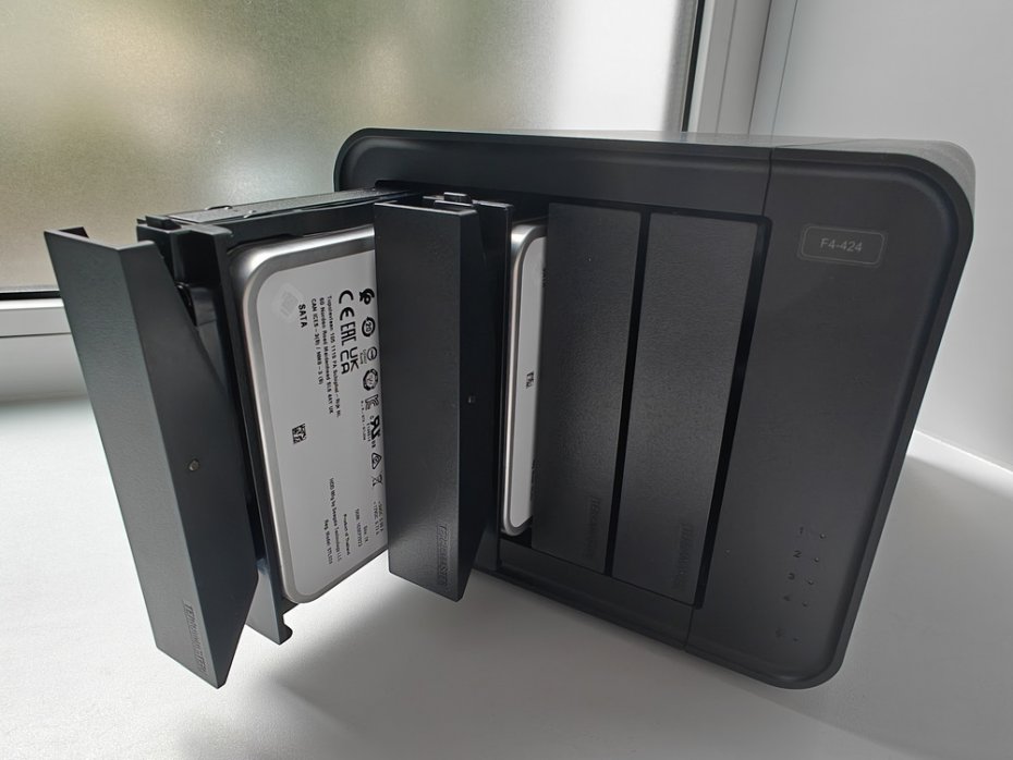 Внутреннее оснащение F4-424 впечатляет: материнская плата с процессором Intel N95, 8 ГБ оперативной памяти DDR5, работающей в двухканальном режиме, с возможностью расширения до 32 ГБ, два сетевых порта со скоростью 2,5 Гбит/с, пара высокоскоростных USB 3.2 Gen 2 для подключения периферийных устройств, HDMI для вывода изображения на внешний монитор и охлаждающий вентилятор. Общую производительность можно увеличить, установив один или два NVMe SSD в слоты M.2 для кэширования. Поддерживаются различные уровни RAID, а также файловые системы BTRFS и EXT4. Вентилятор работает почти бесшумно, он необходим для охлаждения накопителей, чтобы они не вышли из строя из-за перегрева.