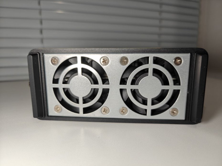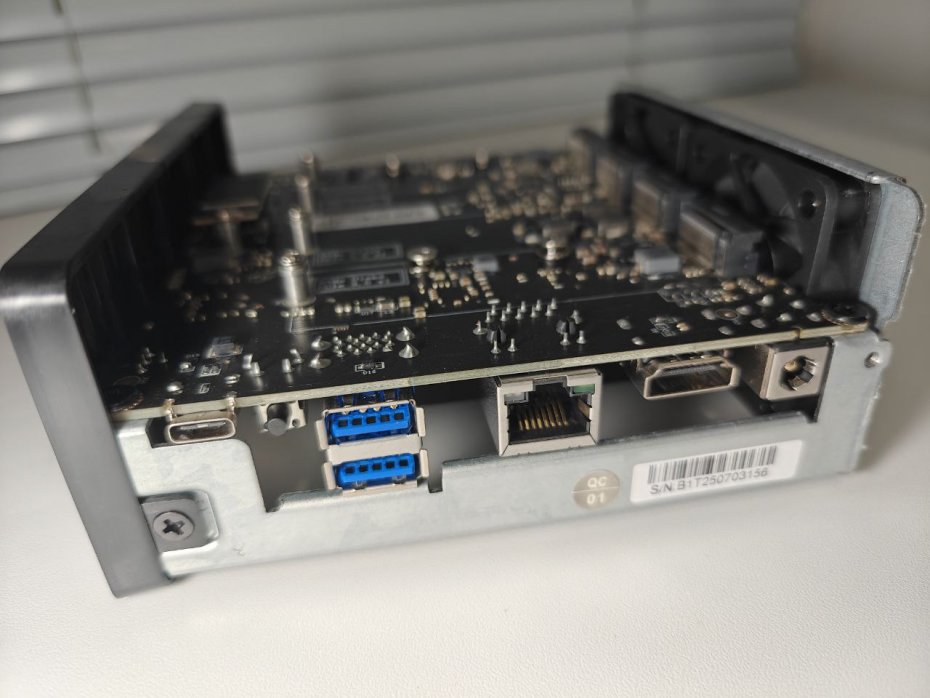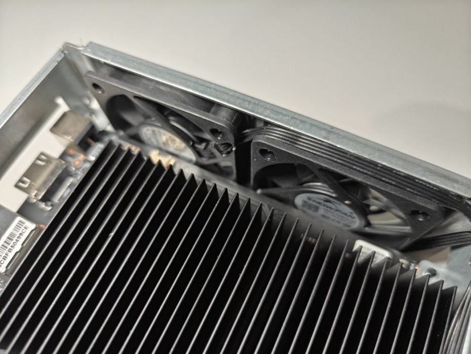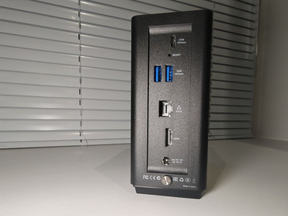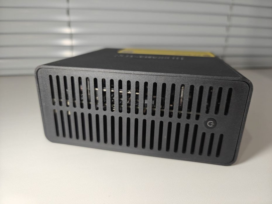 Дизайн выдержан в строгом стиле с минимальным количеством деталей. Однако главное — это продуманная система охлаждения. Внутренняя компоновка обеспечивает конвекционный поток воздуха сверху вниз, чему способствует перфорация на верхней панели и два 50-миллиметровых вентилятора снизу. Они направляют воздушный поток одновременно на SSD и на массивный пассивный радиатор, прикрывающий процессор Intel N95. Такая система позволяет эффективно отводить тепло даже под нагрузкой, не прибегая к шумным оборотам.