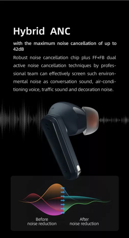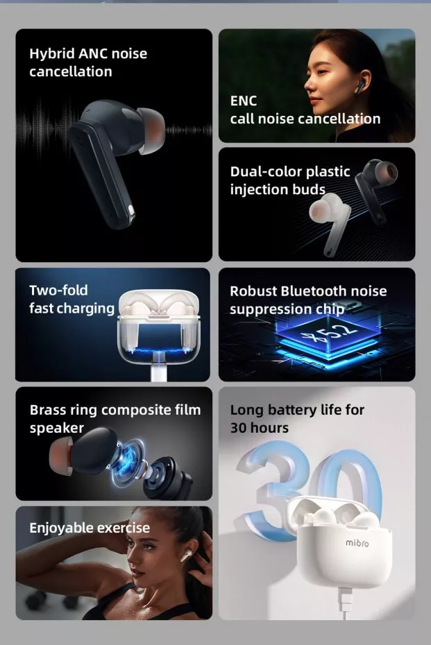Mibro AC1 — TWS-наушники со стильным дизайном, умным шумодавом и защитой от воды. Они поддерживают Bluetooth 5.3 и три уровня активного шумоподавления (самый мощный — 42 дБ, что очень много). В наушниках используются 10-мм динамические драйверы с глубоким и реалистичным звучанием и 4 микрофона, которые задействуется при разговоре по телефону, в чатах, записи голосовых сообщений и в шумодаве. Модель очень лёгкая, надёжная, не маркая, рассчитана на 40 часов использования при подзарядке от кейса. Корпусы этих наушников выполнены из матового пластика, поэтому не собирают отпечатки пальцев и всегда выглядят опрятно.