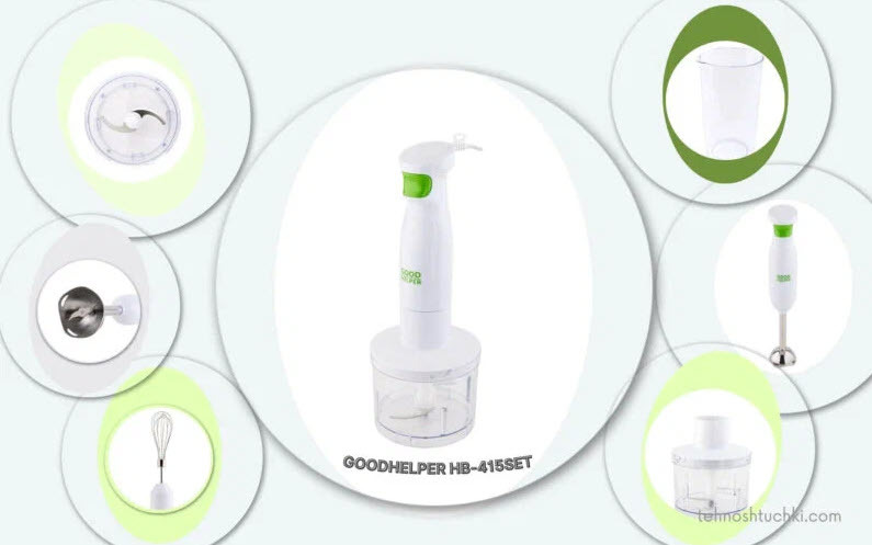 Блендер GoodHelper HB-415SET оснащен вместительной чашей и несколькими функциональными насадками. С помощью острых лезвий, выполненных из нержавеющей стали, он с легкостью измельчает любые продукты для приготовления пищи по вашим любимым рецептам. Венчик в комплекте поможет сделать нежный крем для десертов, соус для вторых блюд или взбить яичные белки. А еще одна насадка отлично справится с приготовлением овощного или фруктового пюре.