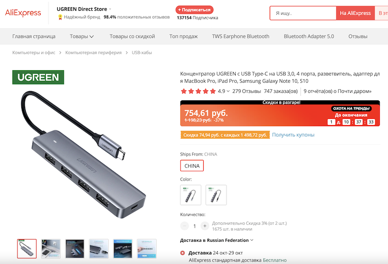 USB-концентратор UGREEN с 4 портами