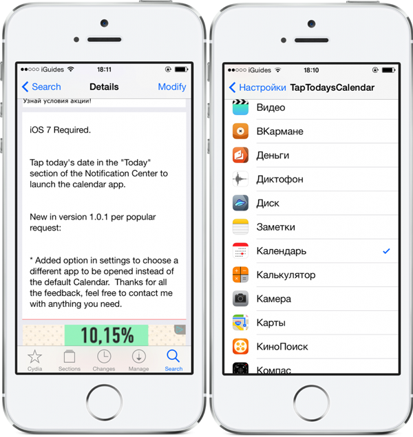 По умолчанию в iOS 7 из шторки центра уведомлений можно перейти только в приложение Погода, нажатие на дату календаря не даст ничего. Твик TapTodaysCalendar решает эту проблему, и теперь из ЦУ можно быстро попасть в календарь. Причем в настройках твика можно переназначить приложение на любое другое.