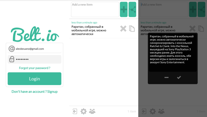 Belt.io работает в связке сайта и приложения для Android и iOS, источником и приемником текста может быть любая сторона — и компьютер, и мобильное устройство. Регистрируетесь на сайте, устанавливаете приложение на смартфон или планшет и залогиниваетесь в него с той почтой и паролем, что вы указали на сайте.