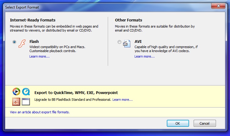 После записи можно сохранить видео в формате, с которым работает FlashBack, экспортировать его в ролик Flash для публикации на сайте или один из общепринятых видеоформатов, какой именно — зависит от установленных на компьютере кодеков.