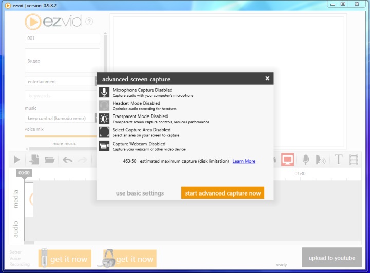 При быстром режиме Ezvid производит видеозапись полного экрана без звука. Дополнительные настройки позволяют выключить запись с микрофона, указать область экрана, которая будет захвачена или выбрать другой источник изображения, например, веб-камеру. Чтобы видео не было скучным, к нему можно добавить музыку, в программе содержится несколько десятков свободных от копирайта треков.