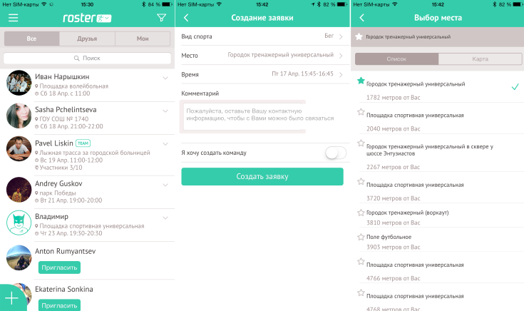 С помощью Roster можно создать собственное мероприятие либо присоединиться к уже существующим. Участники тренировок или соревнований выбираются из зарегистрированных пользователей приложения. У них указаны интересующие их виды спорта, а также сведения о том, в каких местах они занимаются спортом и в каких командах состоят.