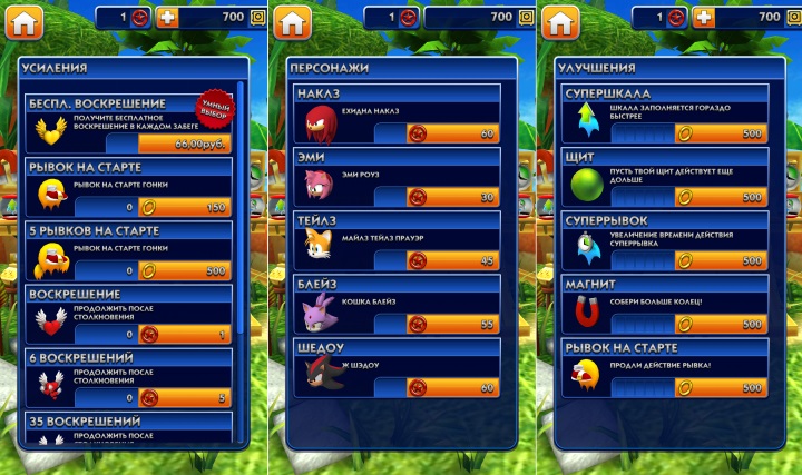 На собранные в забегах желтые кольца и более редкие красные можно покупать улучшения, ускорители, усилители, множители и прочие штуки, помогающие убежать подальше и заработать больше очков. Раз в день можно крутить рулетку и забирать приз. Кольца доступны бесплатно после выполнение игровых заданий и просмотра рекламного видео, но их можно купить и за настоящие деньги. Помимо Соника в магазине доступны другие персонажи, знакомые многим по предыдущим играм этой серии. Фанатов игры порадуют бесплатные обои для смартфона, размещенные в отдельном разделе магазина. После любой покупки на сумму от 129 рублей в игре отключается реклама.