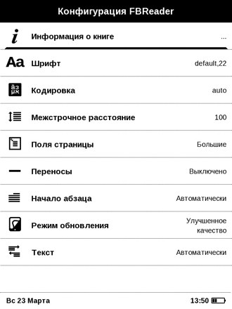 Также доступен выбор шрифта - со сглаживанием или без - и выбор режима обновления страницы. Как известно, полная перезаливка электронных чернил занимает время (и сопровождается миганием фона), если хочется листать быстрее, лучше обновлять экран реже. Но в этом случае текст вскоре станет не очень четким, с артефактами. Насколько часто вы готовы с этим мириться - выбирайте.