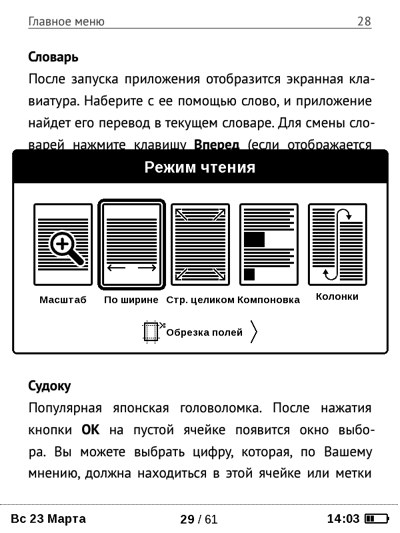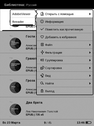 Ридеров в устройстве два - AdobeWiever и fbreader, в целом они похожи, различия в поддерживаемых форматах. А еще у fbreader больше настроек.
