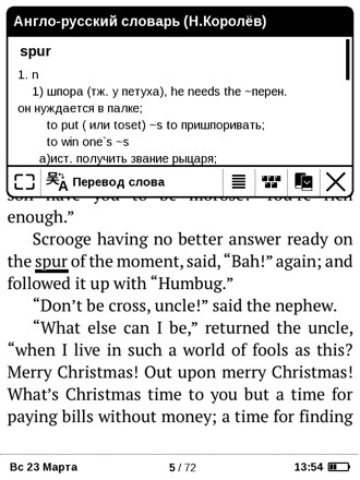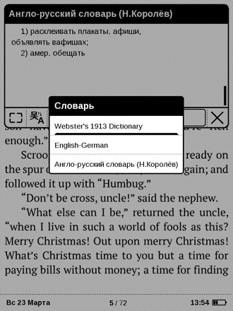 Могу сказать, что ридер очень помог мне, когда решила подтянуть английский. В то время я фанатела от одного сериала и наткнулась на блог, в котором подробно анализировали каждую серию. Мне было безумно интересно это читать, поэтому я просто скопировала несколько десятков постов в doc-файл и закинула в PocketBook. Очень помогал встроенный словарь Lingvo (перевод вызывается быстро, окно словаря не закрывается при перелистывании страницы). Спустя несколько месяцев я читала на английском уже почти также быстро как на русском.