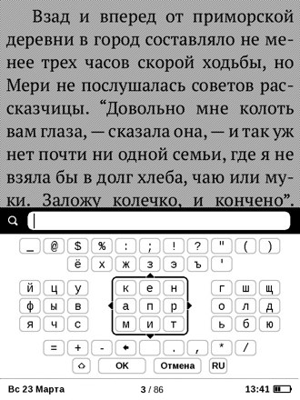 Клавиатура стандартная для покетбуков - все символы объединены в группы для быстрого перехода между ними. Набирать слова долго и неудобно, но иного выхода нет.