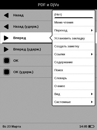 Немаловажный момент: в настройках имеется возможность назначить различные действия на нажатия клавиш в зависимости от форматов книг.