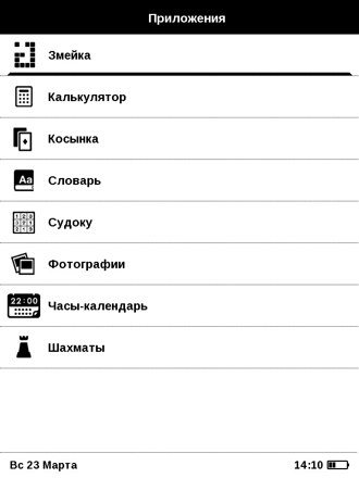 Есть в PocketBook раздел приложений, где можно найти продвинутый калькулятор, словарь, фотоальбом с возможностью слайдшоу, часы с календарем (видимо, для использования книжки в виде настольных часов, оригинальное извращение, простите). Имеются игрушки - змейка, косынка (карты), судоку, шахматы. Все программки простенькие, для экрана на электронных чернилах самое то.