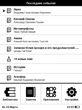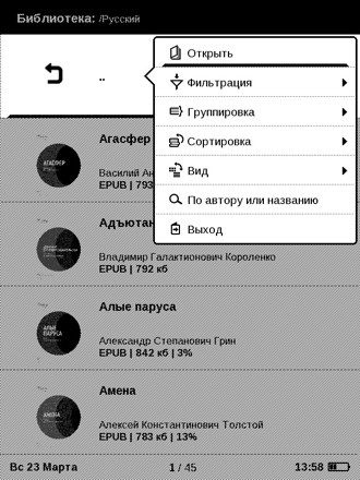 На главном экране - список книг (последние открытые и новые загруженные). Вся библиотека - за одноименной иконкой в нижнем ряду, там отображаются ваши файлы и папки. Если задержать палец на центральной кнопке джойстика, то откроется меню, где можно сортировать книги, осуществлять поиск.
