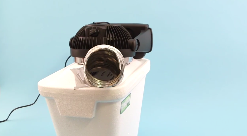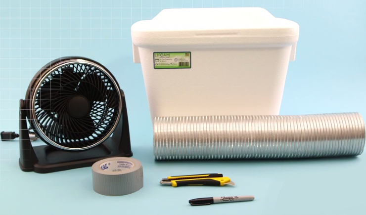 Положите в ведро лёд (желательно в герметичных пакетах) или бутылки с замороженной водой и наденьте сверху пенопластовую крышку, на которую закреплен вентилятор и труба. Включите вентилятор. Воздух будет проходить рядом со льдом, охлаждаться и выдуваться через трубу.