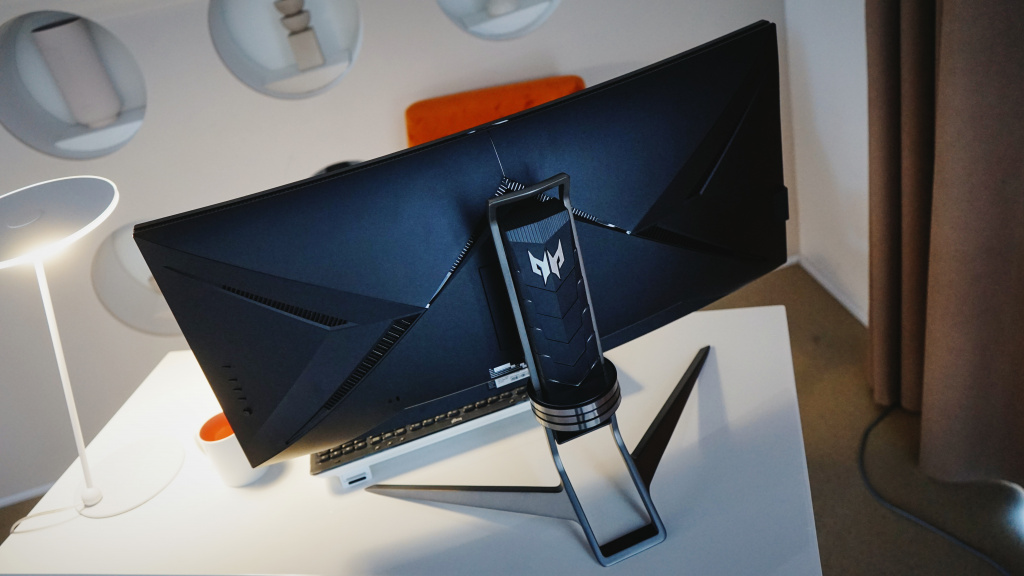 Корпус Predator X34GS изготовлен в тёмных тонах, а в подставке преобладают элементы в цвете металлик. Матовая поверхность хорошо устойчива к отпечаткам пальцев. Стильная стойка выглядит футуристично, но в то же время без излишеств, а в её нижней части расположена специальная вставка для прокладки кабелей. Верхняя её часть оборудована специальной ручкой-перекладиной, которую можно использовать для переноски монитора. Механизмы крепления, а также шасси для регулировки высоты и наклоны выполнены очень добротно с плавным и уверенном ходом без люфта и скрипов. Что касается дизайна в целом, несмотря на ярко выраженную принадлежность Predator X34GS к геймерской линейке, он отлично впишется в любой интерьер, будь то минимализм в светлых тонах или лофт. Обратите внимание на наши фотографии, на них хорошо видно, что устройство превосходно вписалось в комнату с обстановкой в светлых тонах, а благодаря контрасту отлично дополнило её.