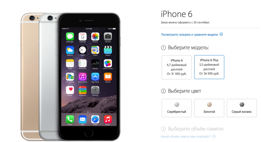 iPhone 6 с экраном 4,7 дюйма обойдется покупателям в 31 990 рублей за версию с 16 ГБ памяти. Модели на 64 и 128 ГБ будут стоить 36 990 и 41 990 соответственно. iPhone 6 Plus с диагональю дисплея 5.5 дюймов в самой доступной конфигурации будет стоить в России от 36 990 рублей, за среднюю и старшую версии нужно быть готовым выложить 41 990 или 46 990 рублей. Предзаказы будут приниматься начиная с 26 сентября.