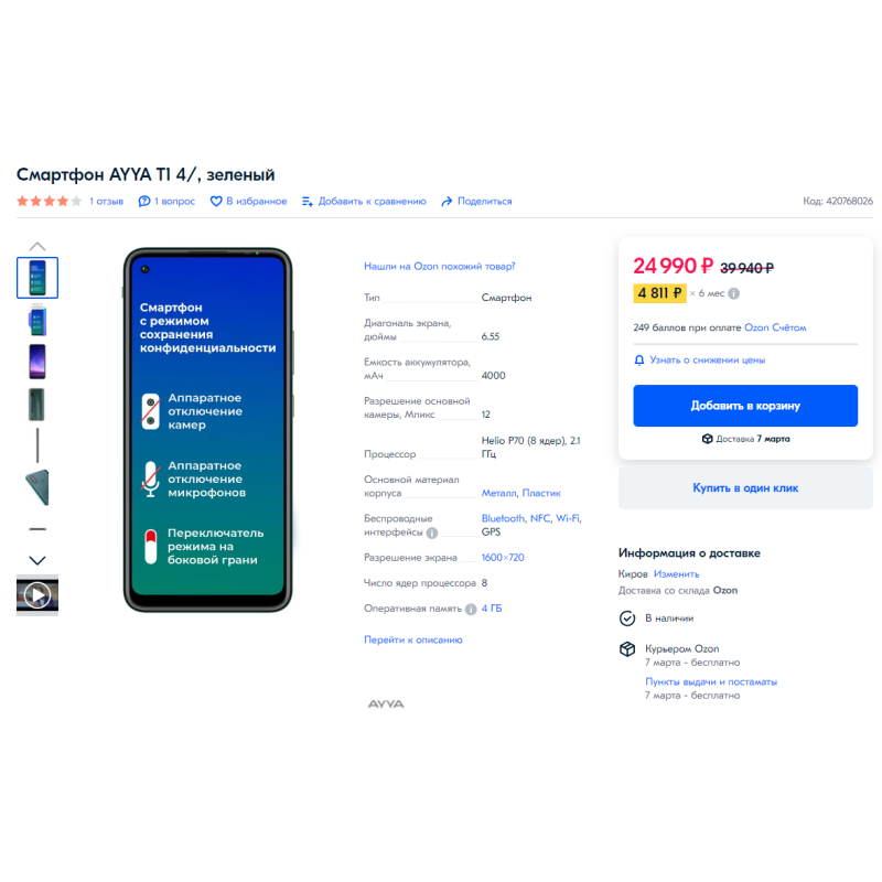 AYYA T1 продаётся в различных интернет-магазинах и на маркетплейсах. Он был представлен в прошлом году, и судя по количеству продаж и отзывов, не особо пользуется спросом. Google показывает, что недавно он стоил 14 990 рублей, а сейчас цена на него выросла до 24 990 рублей (без скидки якобы было 39 940 рублей — и это напрямую от официального дистрибутера).