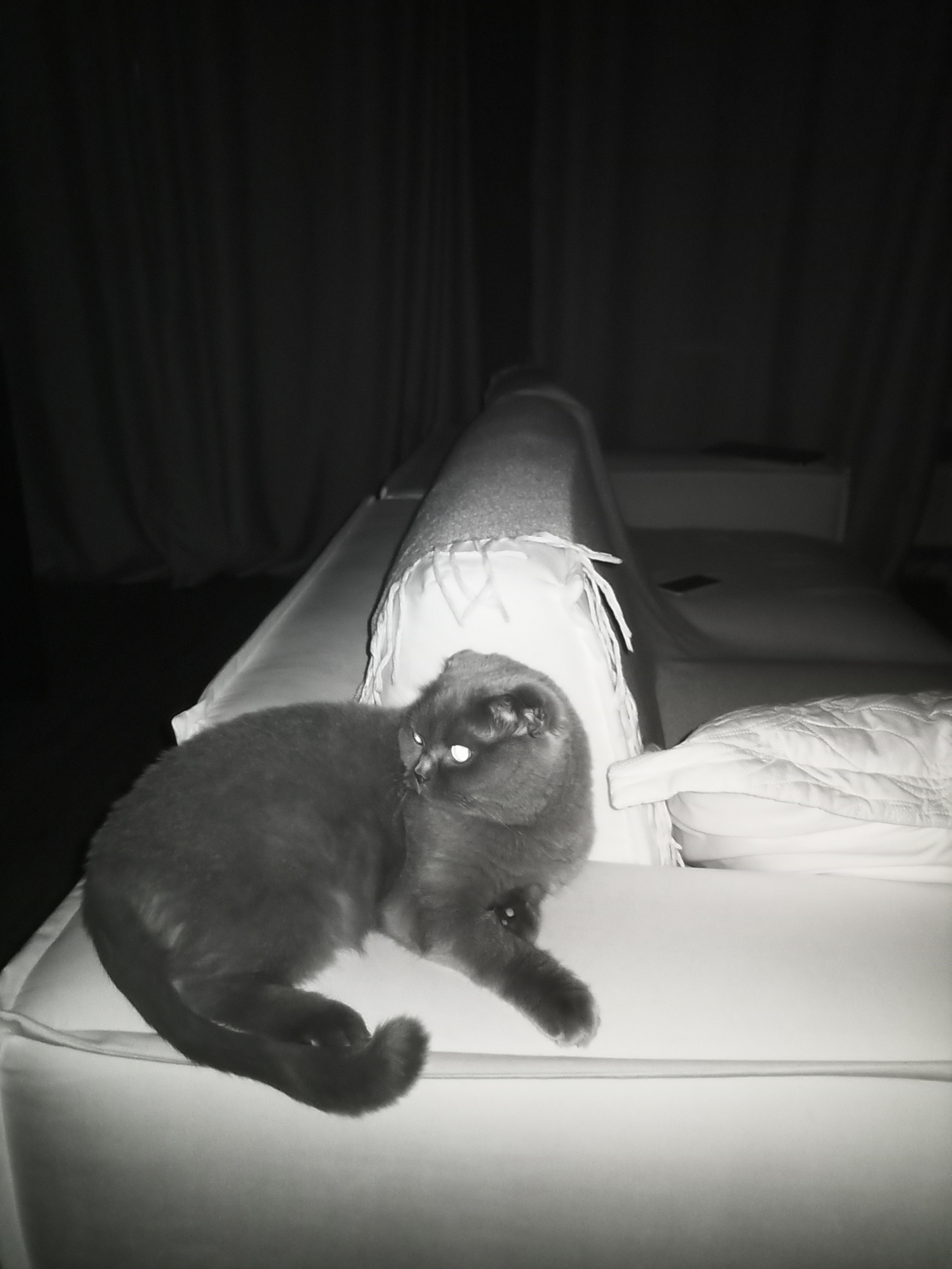 Особенность этой камеры — режим ночного видения. Он позволяет четко отображать объекты в темноте без помощи любого искусственного света. Для его работы на камере размещены два инфракрасных датчика, которые считывают расстояние от камеры до объекта и тем самым помогают оптике определить их. Сложнейшая ситуация: съемка в полной темноте — снимаем кошку. У iiiF150 R2022 получается передать ее силуэт и объекты вокруг. Детализация при этом не важна, задача ночного видения — передавать объекты, которые человек не видел бы невооруженным глазом.