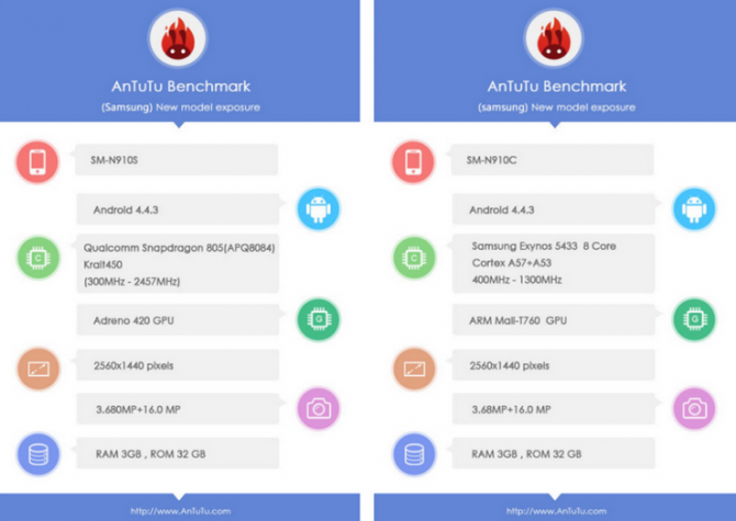 В логах бенчмарка AnTuTu появились две версии фаблета Samsung Galaxy Note 4. Одна модель работает на четырехъядерным процессором Qualcomm Snapdragon 805 с тактовой частотой 2,5 гигагерца и видеоускорителем Adreno 420, другая — на 64-битном восьмиядерном чипсете Samsung Exynos 5433 с максимальной тактовой частотой 1,3 гигагерца и графикой Mali-T760.