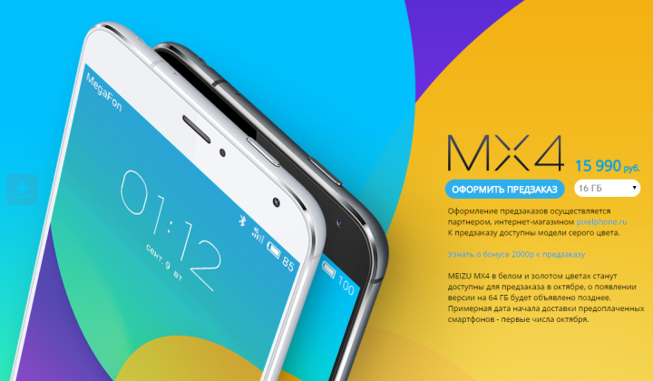 Официальный российский сайт Meizu в России начал принимать предварительные заказы на флагманский смартфон MX4. Версия с 16 гигабайтами встроенной памяти будет стоить 15990 рублей, а с 32-гигабайтным накопителем 17990 рублей. В продажу они поступят в октябре. Чуть позже выйдет MX4 с 64 гигабайтами памяти по цене 19990 рублей. Те, кто оформят заказ с предоплатой, получат купон на 2000 рублей для покупки аксессуаров.