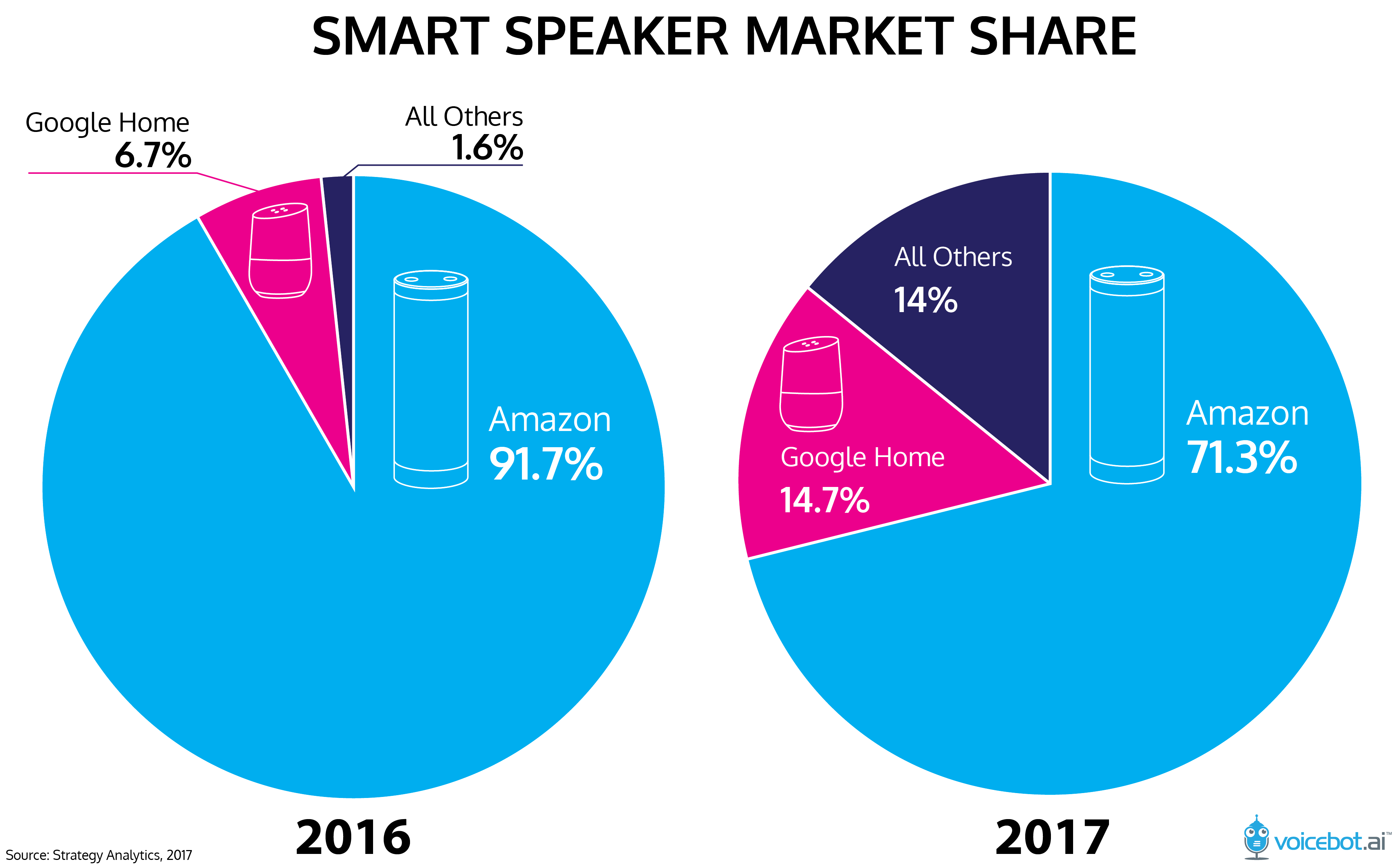 С колонкой другая ситуация. По данным VoiceLabs, в год ее презентации (2017-м) уже было продано 24,5 млн. умных колонок, а на рынке образовалась дуополия Amazon и Google Home — эти бренды вдвоем занимали 86% рынка. Чтобы конкурировать с ними, нужно удивлять функциями и ценами.