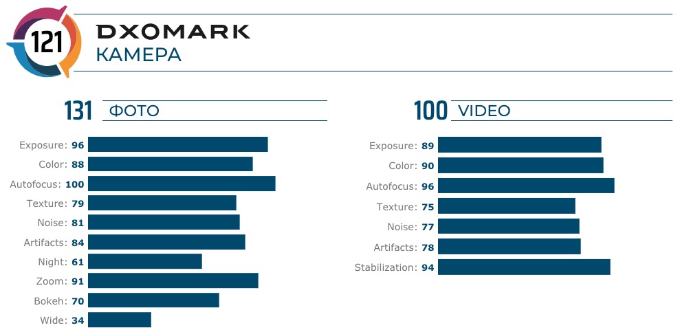 В общем зачете основная камера флагмана набрала 121 балл — это на четыре очка выше тестов Galaxy Note10+. Этот результат получился из результатов 131 балл за фото возможности и 100 баллов за видео. Селфи-камера Mate 30 Pro набрала 93 балла по рейтингу DxOMark.