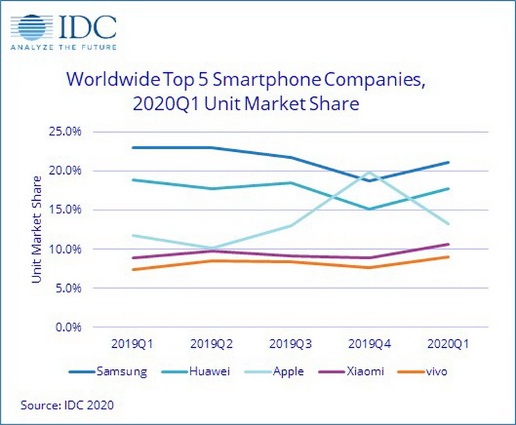 Лидером по количеству мировых поставок смартфонов в первом квартале стала Samsung. Компания отгрузила 58,3 миллиона устройств, а это 21,1% от общего объема. Тем не менее, этот показатель на 18,9%, чем в 2019 году. В первом квартале прошлого года доля Samsung составляла 23%.