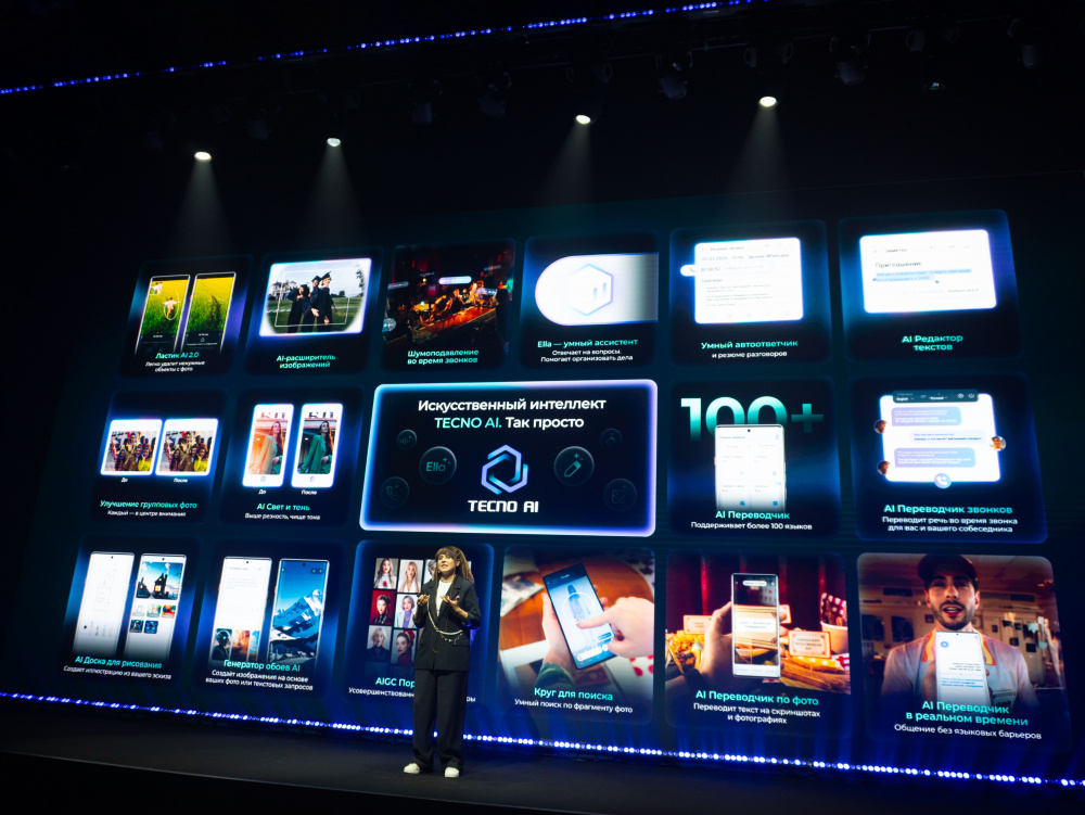 Как и полагается, основная часть презентации прошла на сцене. В первую очередь представители TECNO поделились результатами проделанной работой — за время присутствия на российском рынке компания вошла в топ-5 самых популярных брендов в данном сегменте.