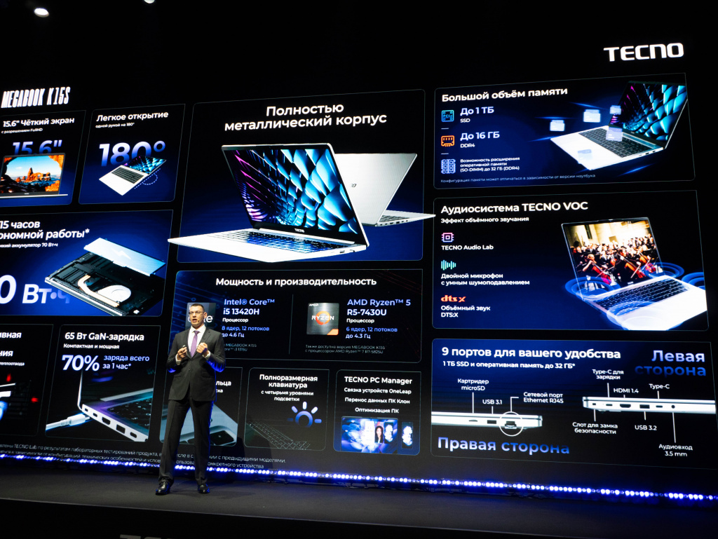 Ну и на последок TECNO рассказали о ноутбуке MEGABOOK K15S. Устройство снабдили металлическим корпусом и поворотным шарниром, позволяющим откидывать дисплей на 180 градусов. При этом конфигурация доступна в разных конфигурациях и старается угодить как фанатам процессоров Intel, таки приверженцев чипов AMD. Но, пожалуй, одной из главных фишек стала возможность самостоятельно увеличить объем «оперативки» с 16 до 32 ГБ.