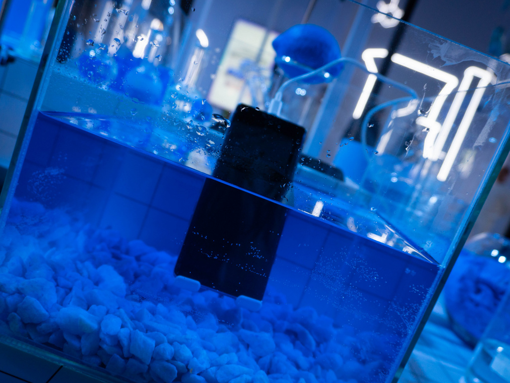 В краш-тест зоне смартфоны предлагалось от души приложить о твердый кафель или стол, воспользоваться разными предметами разрушения, а также поместить в разного рода субстанции и сыпучие вещества.