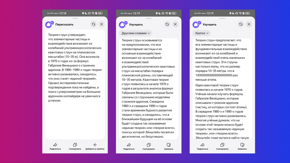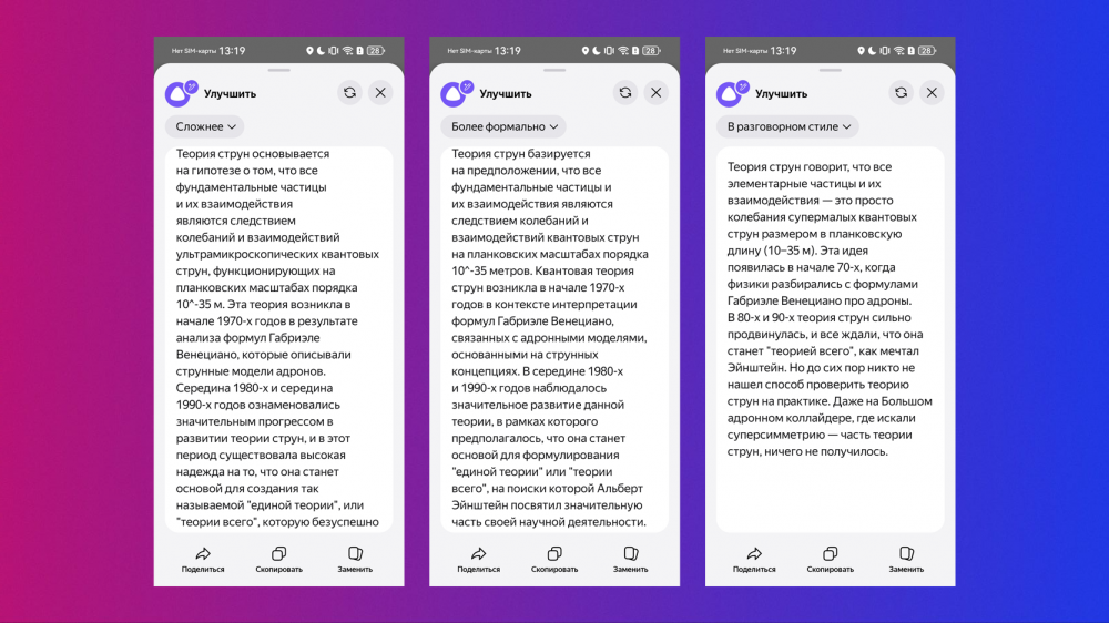 • Улучшить — делает текст короче, сложнее, формальнее, перескажет другими словами или в разговорной форме