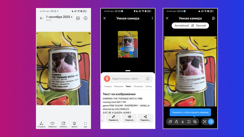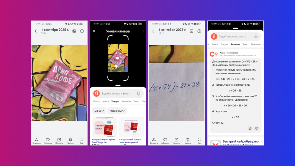 А еще в Pura 80 добавили умную камеру Яндекса. Поиск по фото делается прямо из «галереи», достаточно зажать фото двумя пальцами, ИИ проанализирует изображение и предложит несколько вариантов на выбор. Например, поможет найти товар в интернете, решит задачу или уравнение, переведет текст.