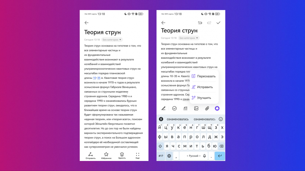 Не обошлось и без нововведений. Главной фишкой Pura 80 стала интеграция с Алисой Яндекса. Ассистент теперь работает в «заметках». Для активации ИИ достаточно найти знакомую иконку на панели редактирования. Контекстное меню откроет три пункта для работы с текстом: