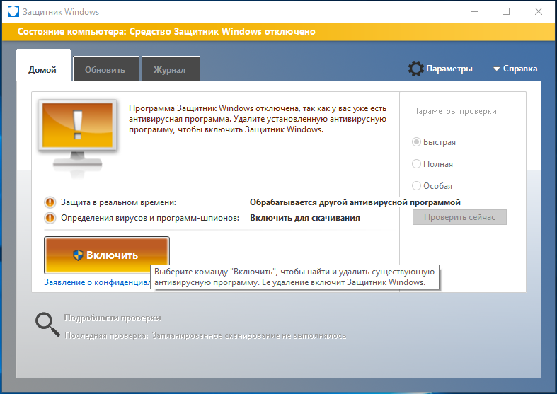 «Даже если пользователь поставит сторонний антивирус, Windows 10 всё равно будет рекомендовать ему активировать Defender, указывая, что до этого момента в операционной системе будет отключена защита. При активации встроенного антивируса сторонняя программа будет удалена».