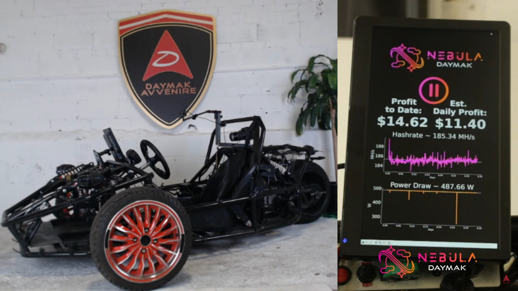 Компания Daymak решила продемонстрировать необычные возможности своего трёхколёсного гоночного электрического миникара Spiritus. Он оснащён графическим процессором неназванной марки и может майнить криптовалюту в период простоя (вероятно, чтобы отработать сжигаемую электроэнергию). С машины пришлось снять корпус, чтобы она эффективнее остывала.