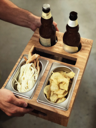 Конечно, этот поднос не такой крутой и технологичный, как Couch Console, но и цена на него намного ниже. Он выполнен из дуба и ясеня с пропиткой минеральным маслом, содержит два стальных отсека для закуски, два места для напитков и ёмкость для размещения смартфона или пульта от телевизора. Габариты — 35×25×10 см.
