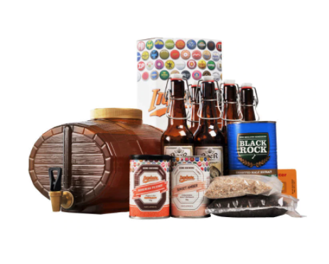 Набор для варки пива в домашних условиях. Содержит всё необходимое и даже 18 полулитровых бутылок для разлива готового продукта. Если пиво вдруг окажется удачным, можно использовать повторно бочку и разные аксессуары, придётся докупить лишь дрожжи, солодовый экстракт и чистящее средство.