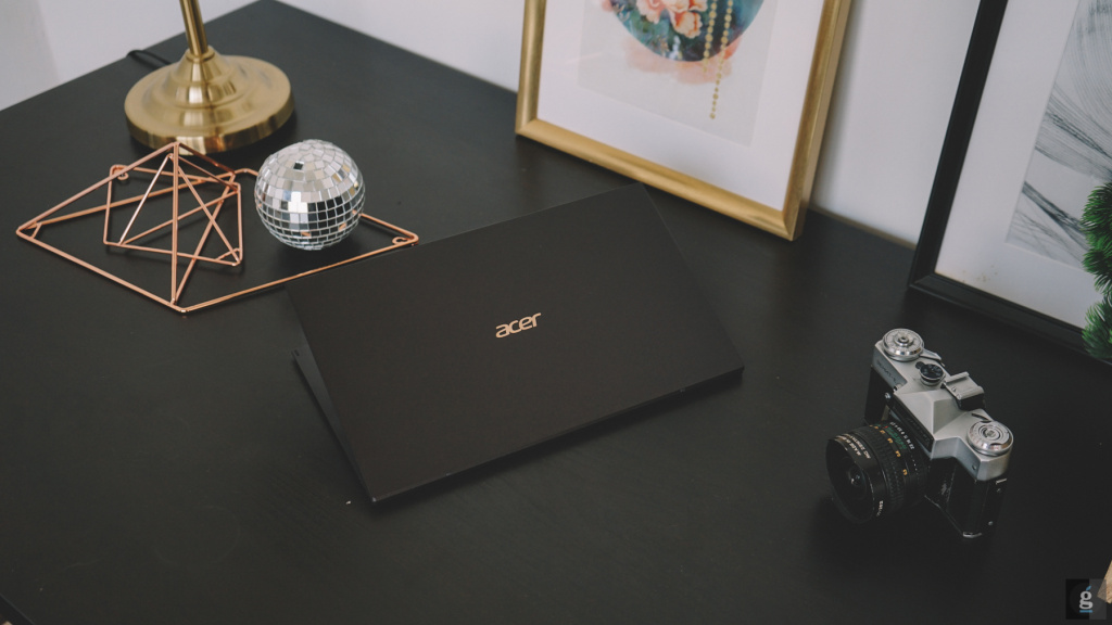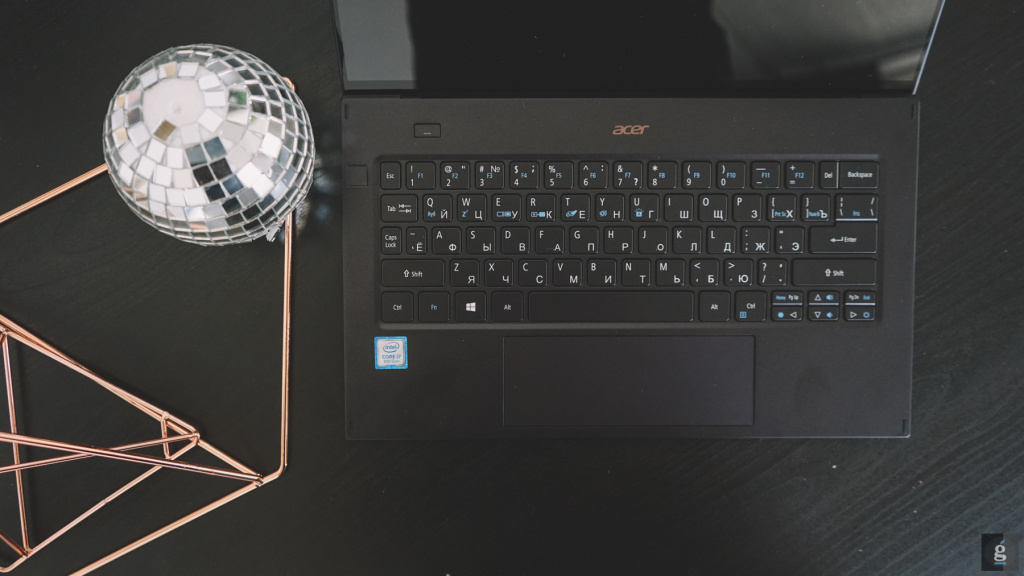 Впрочем, компактные размеры Swift 7 обеспечивает не только материал корпуса, но также и другие решения инженеров и дизайнеров Acer. Например, 14 дюймовый экран тут практически безрамочный, его площадь относительно лицевой поверхности составляет 92%. Фактически это говорит о том, что этот показатель в ноутбуках приблизился к нынешним трендами в безрамочности экранов смартфонов. Для дисплея Swift 7 маркетологи Acer придумали название ZeroFrame. Рамка тут, конечно же, не «зеро», но ее ширина в 2.57 мм — это все равно очень крутое достижение для ноутбуков. Разумеется, для этого пришлось отказаться от веб-камеры в традиционном для нее месте. Она выполнена в виде отдельного модуля, расположенного чуть выше клавиатуры. В неактивном положении вебка утоплена в корпус, а для активации нужно на нее нажать — и тогда камера приподнимется над поверхностью. Минусы этого решения все-таки есть, не всем нравится ракурс, когда камера снимает лицо снизу вверх, но к этому можно привыкнуть. Как ни крути, компактность корпуса и отсутствие рамки в верхней части экрана намного важнее.