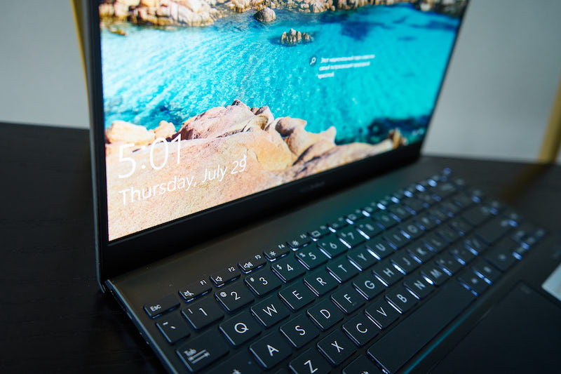 Интересна конструкция корпуса в открытом состоянии — тут нижняя часть с клавиатурой и тачпадом располагается под углом, из-за чего обзор клавиатуры лучше, работа кулеров эффективнее, а звук слышен отчетливее. В ZenBook 13 OLED применяется эксклюзивный экранный шарнир ErgoLift, благодаря которому клавиатура располагается под наиболее удобным для рук углом.