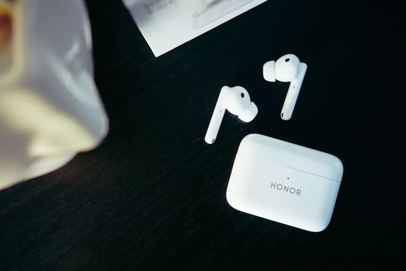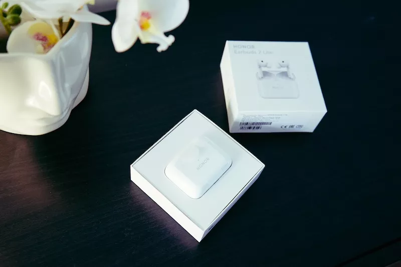 С точки зрения внешнего вида Honor последовала тренду. Белый цвет, прямоугольный кейс, наушники с хвостиками и амбушюрами — гарнитура не выделяется среди конкурентов.