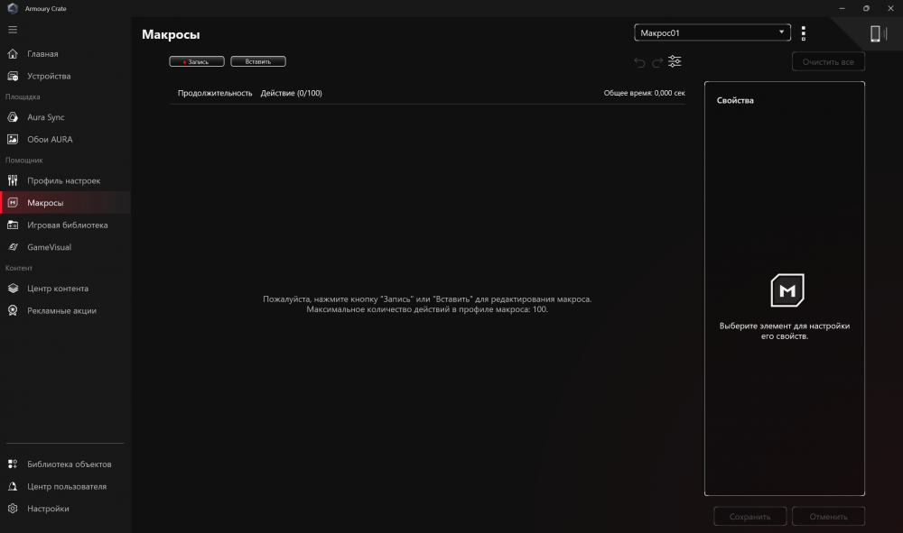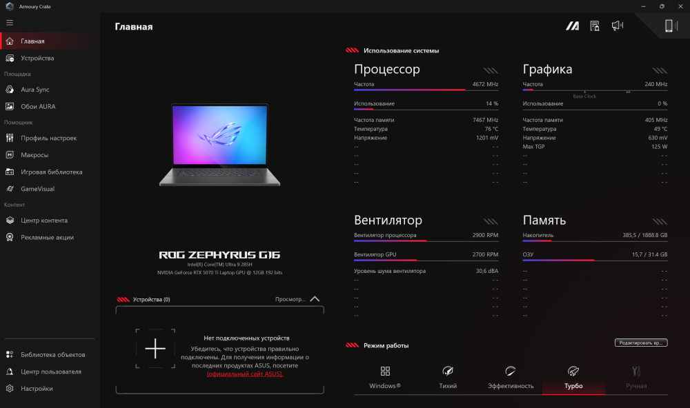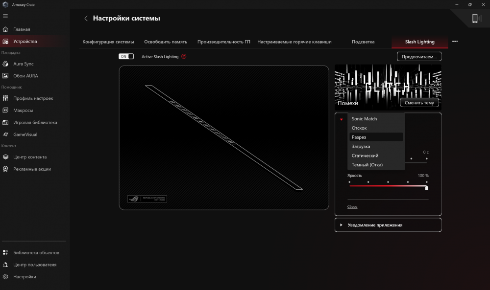 • Armory Crate — центр управления ноутбуком. Здесь можно узнать информацию о работе и нагрузке системы, выбрать или создать анимацию для Slash Lighting, настроить подсветку, упаковать все это в профиль, задать макросы, обновить драйверы. Также есть быстрый доступ к библиотеке установленных игр.