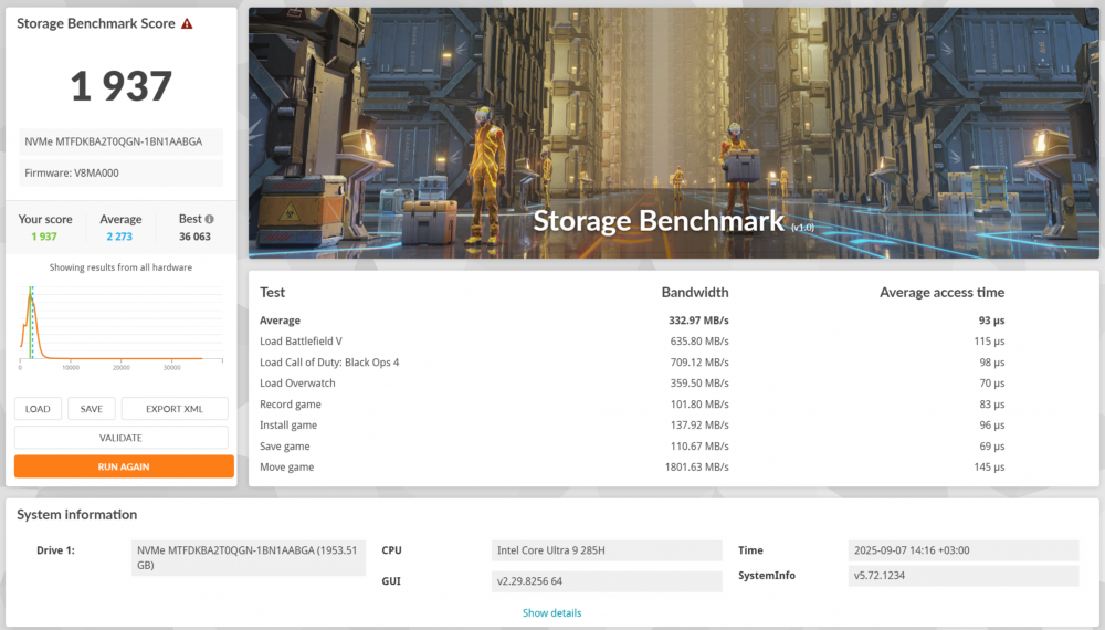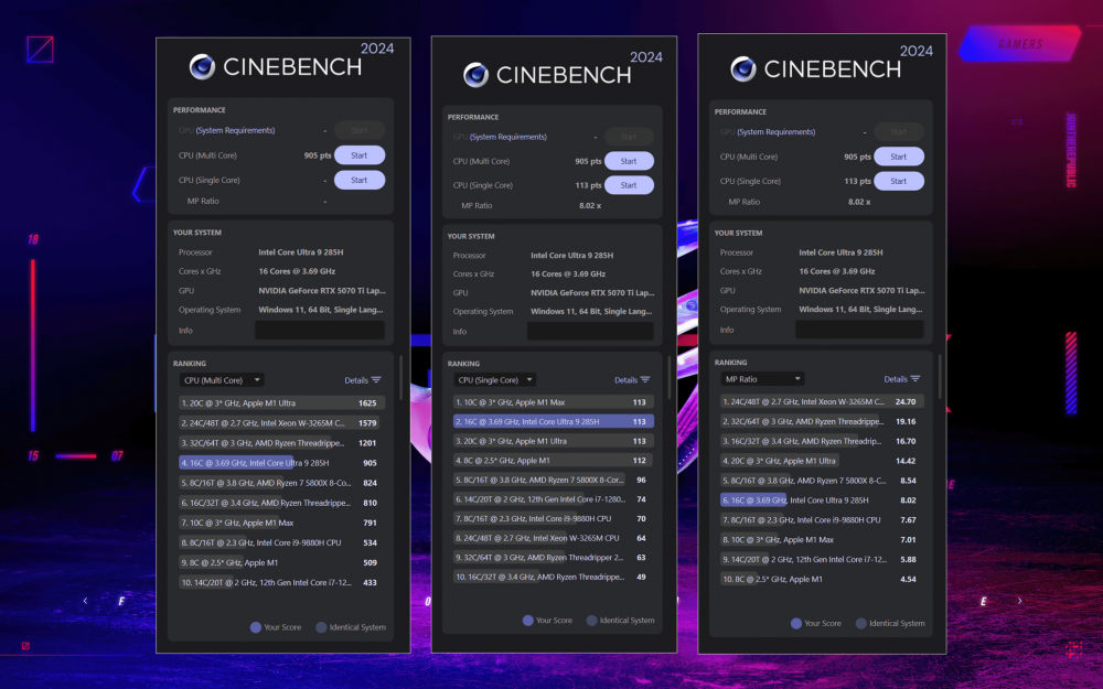 Системой предусмотрено три режима нагрузки: «тихий», «производительность» и «турбо». Чтобы проверить возможности героя обзора, я гонял исключительно на последнем пресете. Для начала я прогнал ноутбук по синтетическим тестам Cinebench, CrystalDiskMark и Geekbench. Вот какие результаты удалось получить.