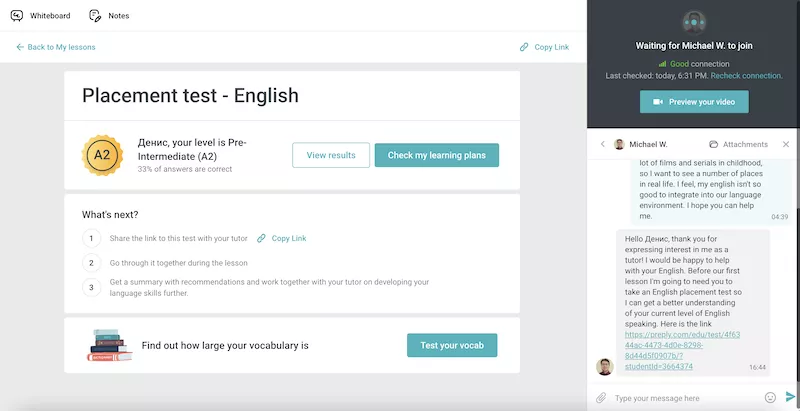 Перед созвоном с преподавателем вы получите тест, по результатам которого будет проводиться занятие. Он состоит из четырех частей, выявляет основные навыки владения иностранным языком: словарный запас, грамматику, понимание иностранной речи и способность разговаривать самому. В конце система оценит ваши знания по шкале, в случае с английским это от A1 до C2.