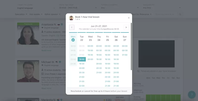 Когда вы выбрали нужного репетитора, можно определять и время занятия, это может быть утро до 09:00 или вечер после 19:00. До работы, после, в перерыве, поздним вечером, когда есть час на себя — в Preply можно заниматься когда вам удобно. Разница во времени — не проблема. Система сама определяет часовые пояса репетитора и ученика. Оплата проходит после того, как вы определились с репетитором и временем занятий, проблем с определением времени созвонов не будет.