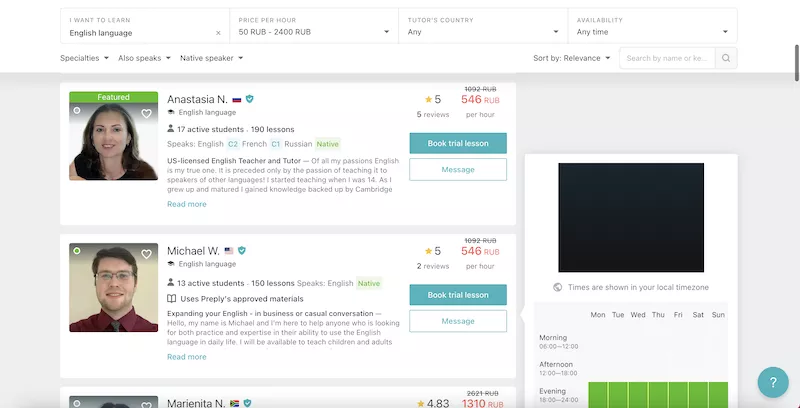 Я выбрал репетитора из США. В ближайшие годы я планирую поехать в Соединенные Штаты, на Preply я искал преподавателя, который поможет усовершенствовать разговорный английский. Также я хотел понять особенности разговора на нем именно в США: произношение, устойчивые выражения (идиомы). Репетитор Майкл предлагал это, поэтому я кликнул на него. Цена занятий — 546 рублей за один час, в среднем большинство репетиторов работают с вами за эту стоимость.