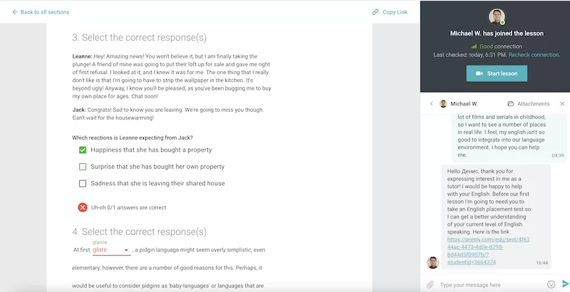 Основная возможность платформы — живое общение с репетитором-носителем языка. Впрочем, это второй этап занятий. А вот все они: